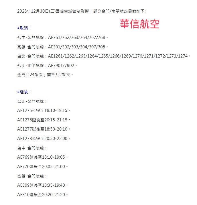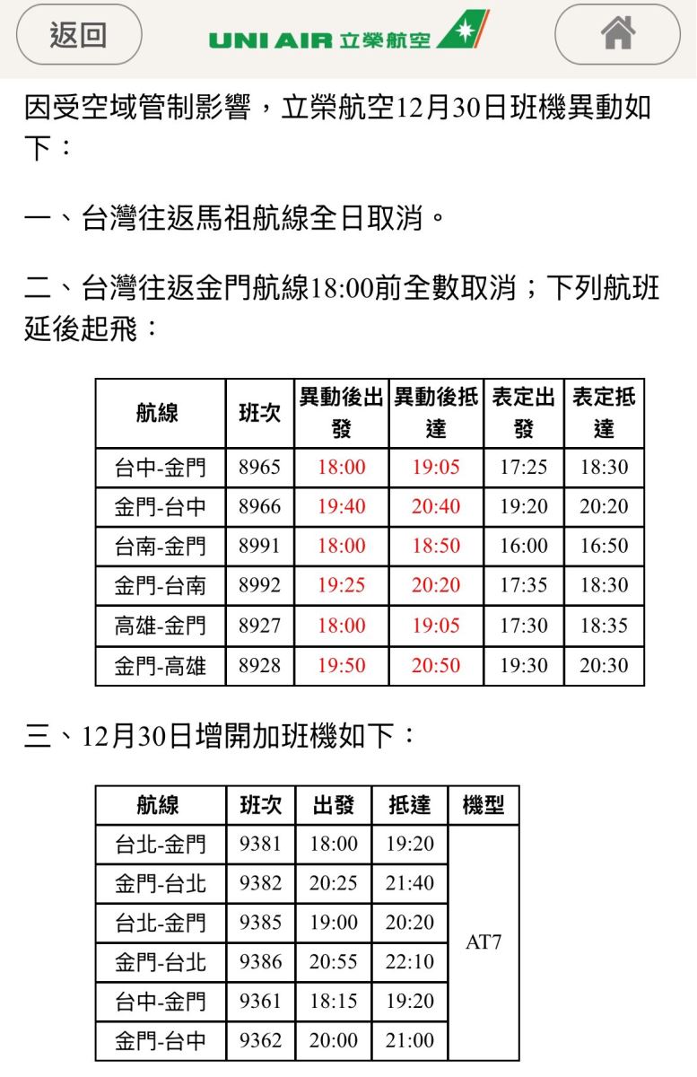 受 中國軍演空域管制影響,今日(12/30)航班異動 提醒搭機旅客及接機民眾多利用航空公司網站、APP查詢班機動態 立榮航空:http://www.uniair.com.tw、(02)2508-6999。 華信航空:http://www.mandarin-airlines.com、 412-8008(手機先撥02) #搭機旅客請注意航班動態~